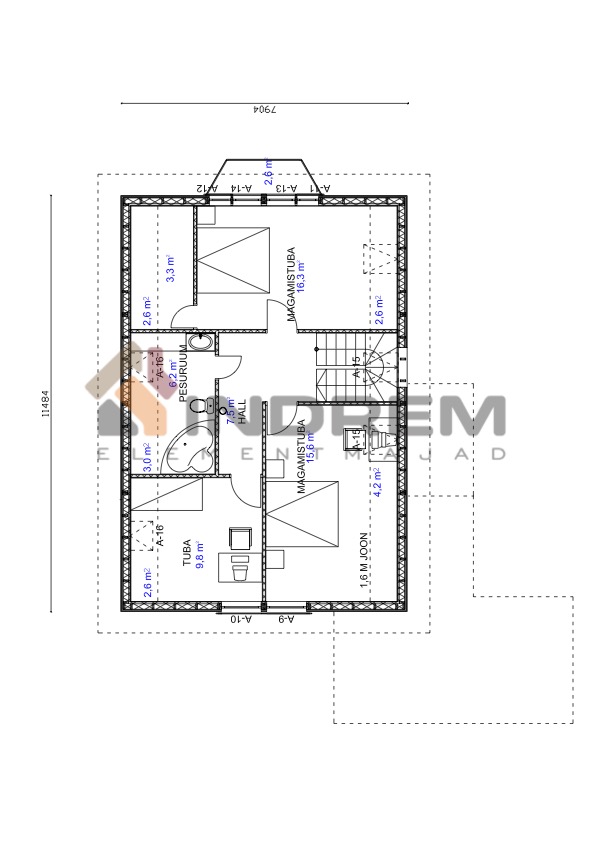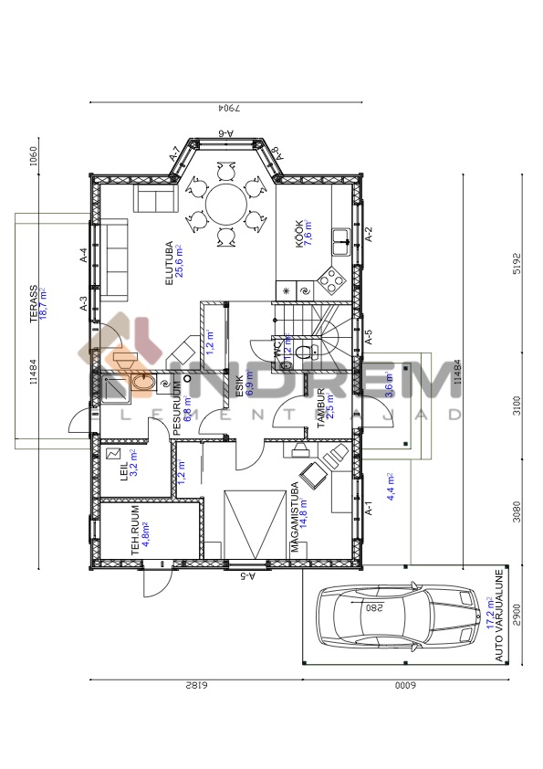 Sisetööd/viimistlustööd: Sisetöödest katame eramu elutoa, magamistoad, köögi ja esiku põrandad parketiga ja pvc põrandaliistudega. Pesuruumi, majandusruumi, tamburi, leiliruumi ja WC põrand katame keraamilise plaadiga. Lisaks katame keraamilise plaadiga ka pesuruumi seinad. Eramu laed on viimistletud valgeks. Niisketes ruumides laed viimistletud valgeks ja kaetud niiskuskindla värviga. Siseseinad viimistleme Tellija valitud värvitoonidega.. Saunaga majadel kasutame elektrikerist. Tehnilise ruumi seinad ja lae viimistleme OSB plaadiga ja katame tulekindla värviga. Tehnilise ruumi põrand on betoonist.